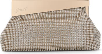 The asymmetrical crystal pouch clutch is a modern and sophisticated accessory that will add a touch of luxury to any outfit. This clutch is made of gold linked crystal and features an etched Jewel branded asymmetrical frame. It is perfect for evening events or any occasion where you want to make a statement.