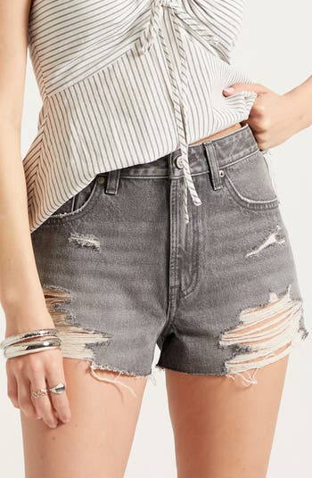 Distressed detailing and a frayed hem amplify the attitude on these high-rise denim shorts cut from rigid cotton with a relaxed fit.