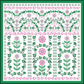“Ivy Parterre” is inspired by the elegance of classical garden designs, where rows of blooming florals and trailing ivy are arranged in refined, ornamental symmetry. The composition balances soft pink blossoms with fresh green foliage, creating a timeless pattern that feels both graceful and modern. Featuring the same color palette on each side, it offers a harmonious look from every angle. Crafted with exceptional attention to detail, the scarf also boasts hand-rolled edges, a luxurious finish, and comes in premium gift packaging.