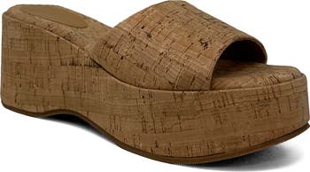 An interwoven design lends textural intrigue to a resort-ready slide lofted by a chunky wedge and platform that are easy to walk on.