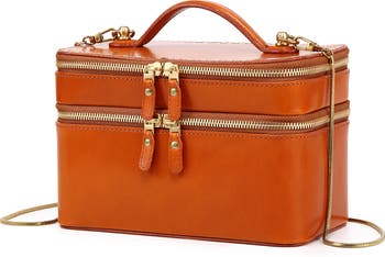 A compact vanity trunk designed for elevated travel organization. Genuine leather craftsmanship meets structured storage for beauty essentials.