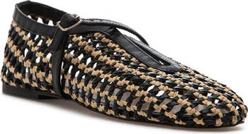 Woven raffia and contrasting leather trim lend artisanal appeal to this ballet flat finished with an adjustable buckle strap and a set on a comfy, cushioned footbed.