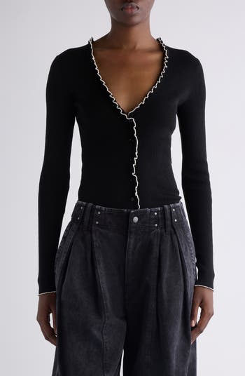 Rippled, contrast lettuce edging outlines this lightweight ribbed sweater knit from fine silk and cotton yarn.