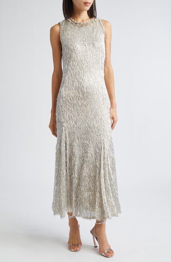 Detailed with fringy beading and sparkly sequins and trimmed with sparkling stones, this event-ready dress is a glitzy way to have all eyes on you.