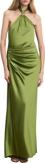 Be a veradant vision in a slinky silk-blend dress accented with a sculpural piece of hardware and designed with a showy open back.