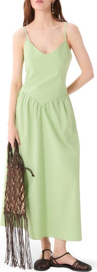 Cut from crisp poplin, this summery sleeveless maxi features slinky adjustable straps and a perfectly flared skirt.