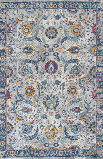 Layer on the cottage style with this colorful rug's traditional Persian design. The family-friendly pattern mixes rich jewel tones with golden yellow, on a distressed gray background for a vintage vibe. It's the perfect start to a rich color scheme in a bedroom, living room, entry, or dining area.