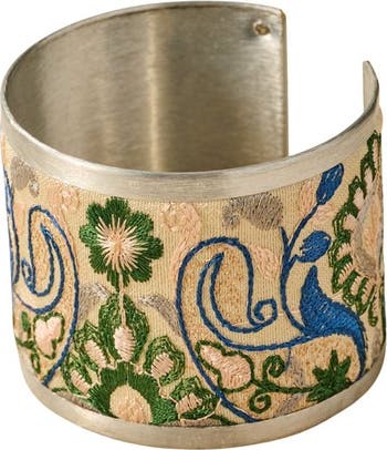 This beautiful bracelet is a unique piece that adds a touch of elegance to any outfit. The adjustable brass cuff is electroplated in brushed silver and features a stunning ribbon inlay. The delicate multi-colored silk thread embroidery makes this a versatile and luxurious accessory. A Ten Thousand Villages Exclusive handcrafted in India.