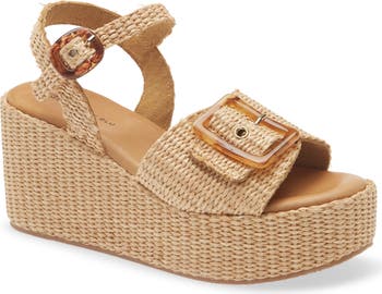 A woven wrapped platform wedge gives eye-catching height to a summery sandal secured by a slender strap at the ankle.