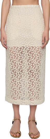 Lacy blooms romance this figure-skimming midi skirt made with a partial lining for sheer charm and finished with an airy back slit for easy movement.