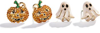 Mix and match with this boo-tiful stud earrings set including sparkly pavé crystal Jack-o'-Lanterns and shimmery enamel ghosts.