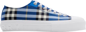 A hyacinth-blue colorway brings fresh energy to the signature Burberry Check topping a sneaker that pairs a low, lace-to-toe profile with a chunky rubber cupsole. The bumper toe and logo-molded heel add a sporty kick to casual, well-grounded look.