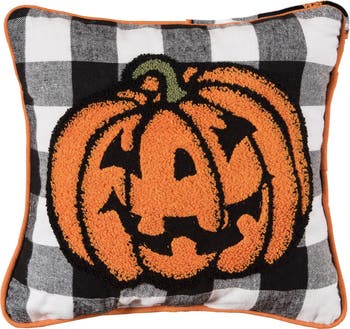 You can't help but smile when sitting down to make costumes or count candy with this tufted grinning pumpkin. This textured jack-o'-lantern sits on black and white buffalo check cotton that gives you the warm autumn look that keeps everyone gathered around the fire and lounging on the couch for one more Halloween story.