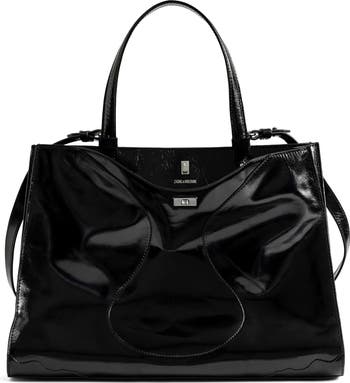 Go for the gloss of a substantial bag made from high-shine patent leather and swung from two sets of straps.