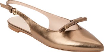A dainty bow highlights the pointy toe of this stunning metallic flat finished with a graceful slingback strap.