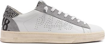 The Jack Spot White features all-over white leather and suede, complemented by grey suede and white-and-black speckled suede accents. White laces, our signature P448 hand-distressed rubber sole and black tread ground the look. Swap in the extra pair of dark grey laces to tie it all together.