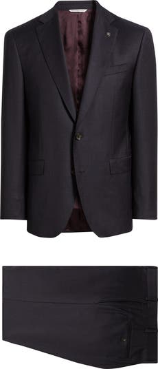 Deep-burgundy Italian wool patterned in a subtle, shadowy check brings refined versatility to a suit tailored with softer construction in the shoulders and a fitted silhouette for a smart, all-occasion look. The flat-front trousers sit right at the waist and feature lightly tapered legs to blend traditional detailing with a crisp, modern profile.
