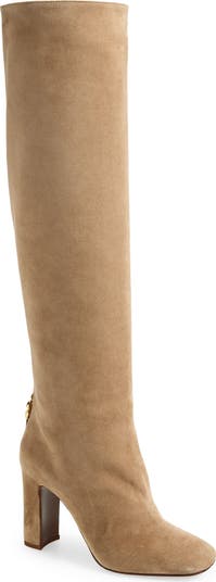 A polished D&G logo gleams at the counter of this lambskin-suede boot constructed in a sleek over-the-knee silhouette framed with a softly squared toe and sculptural heel.