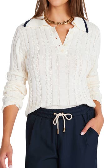Crafted in luxe cotton with a classic cable-knit texture, this polo sweater offers a refined take on an American sportswear staple. It features a quarter length button up down the center with a collared neckline.