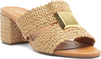 Brushed, geometric hardware highlights the intricately woven upper of a boho-cool slide sandal made in Brazil and lifted by a wrapped block heel.