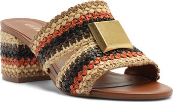 Brushed, geometric hardware highlights the intricately woven upper of a boho-cool slide sandal made in Brazil and lifted by a wrapped block heel.