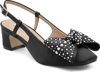 Glossy embellishments adorn the voluminous bow on an elegant satin pump featuring a low block heel and adjustable slingback strap. A cushioned footbed and slip-resistant sole deliver comfort and stability.