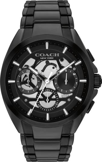 Slender indexes and bold hands distinguish a chronograph watch boasting three subdials that deliver precise timekeeping.