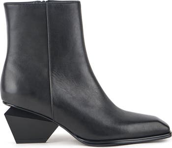 The Jacky Bootie is a pull-on bootie with a sleek, monotone silhouette, an angular toe, and a geometric statement heel.