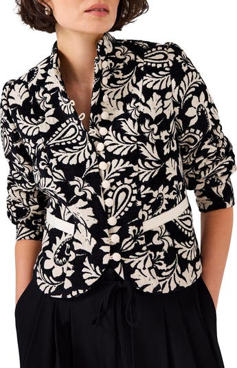 Jacquard paisley jacket in a cropped silhouette featuring a high collar, welt pockets, long sleeves, buttoned cuffs with a button fastening through the front.
