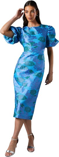 Make a statement at your next special occasion with this exquisite midi dress from Coast. The jacquard fabric creates a luxurious texture, while the floral pattern adds a touch of femininity. The fitted bodice accentuates your curves, flowing into a sleek midi skirt that's perfect for elegant events. The puff sleeves create a romantic silhouette, balancing the streamlined shape of the dress.