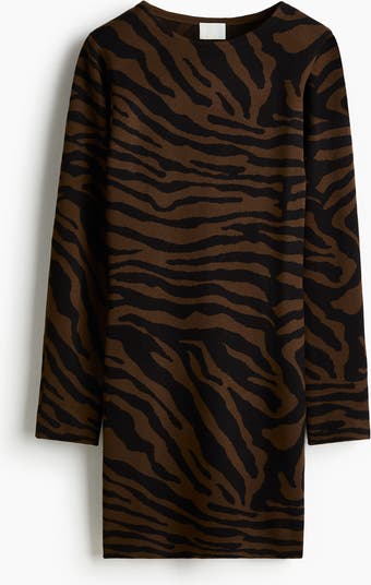 Short, fitted dress in a soft jacquard knit with a boat neckline and long sleeves.