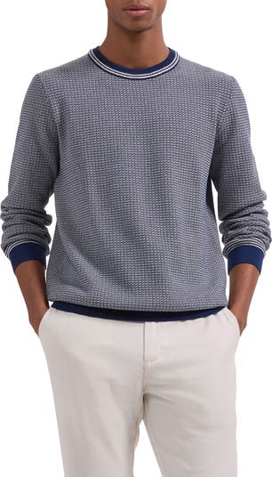 Made in Italy from soft cotton, this crewneck sweater features a refined microjacquard knit that creates a subtle two-tone texture. The ribbed collar and cuffs are accented with contrast stripes for a sporty touch, while the hem is finished with a clean, solid rib to maintain a clean, elevated look.