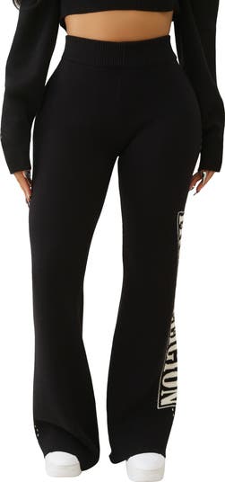 A sporty logo stamps the side of these soft and shapely sweatpants punctuated with flared hems.