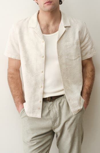 Jacquard texture adds subtle visual depth to this cotton-and-linen enriched camp shirt designed with a relaxed silhouette that feels resort ready and easy to layer.