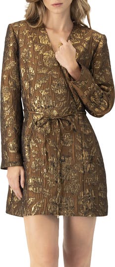 Long sleeve short dress featuring a crossed V-neckline, front pockets, and a waist tie.