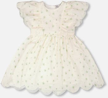 This printed jacquard dress in white with floral motifs is a delicate piece for special moments. The dress features short butterfly sleeves, a scalloped hemline, and a softly flared silhouette that adds charm and grace. Crafted entirely from polyester, it’s a refined choice for festive occasions.