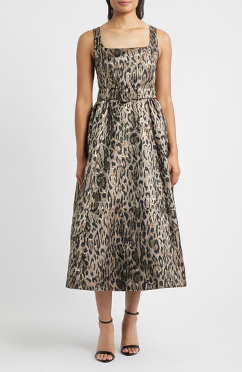 Striking metallic accents and animal spots electrify this charming sleeveless gown made with a fitted square-neck bodice and a perfectly flared skirt.