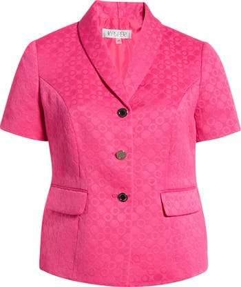 A shimmering jacquard adds texture and dimension to this vivid three-button jacket framed by abbreviated sleeves.