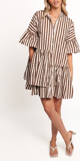 Mismatched flounces give a playful, artsy vibe to this printed shirtdress made of crisp cotton.