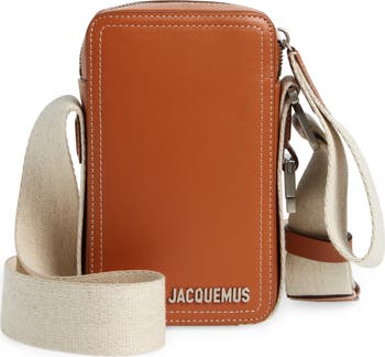 Raised logo lettering brings understated branding to a compact bag meticulously crafted of leather and suspended from an adjustable webbing strap.