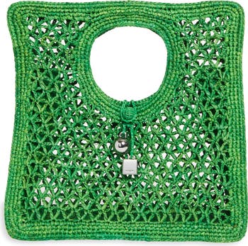 Gleaming geometric charms pop as the solo details on this raffia handbag crafted in a square, slim-silhouette with crocheted-in round handles.