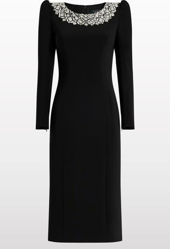 This elegant cocktail dress features a refined fitted silhouette with long sleeves and a graceful round neckline. The bodice is framed by intricate embellishment, creating a striking focal point that catches the light beautifully. A timeless choice for evening occasions, winter receptions, or formal gatherings.