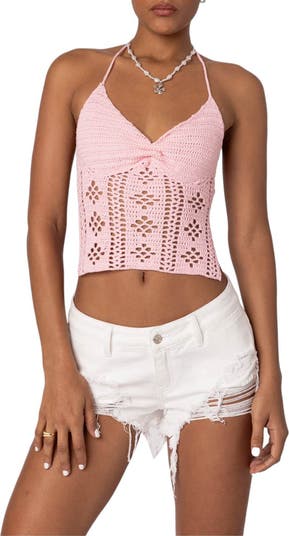 This crocheted, corset-inspired crop top shows off some skin and features a ruched bust and skinny back ties.