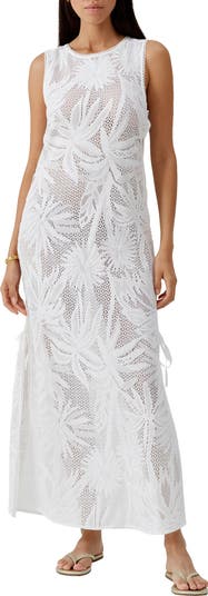 Lace-up side ties tether the fit of this sheer cover-up dress featuring dainty open-knit stitches.