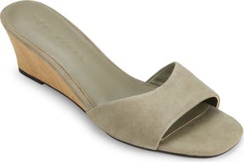 A squared-off toe and woodgrain wedge heel bring distinct elements and balance to a minimalist slide sandal featuring a supple suede upper.
