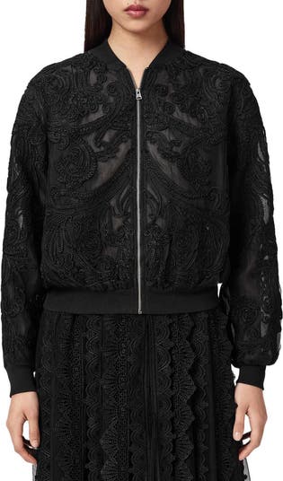 Swirling embroidery brings rich texture to this classic relaxed-fit bomber jacket finished with ribbed trim for a blouson effect.