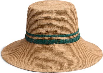Double stripes update the crown of this packable raffia bucket hat that adds a smart touch to your beach-ready look.