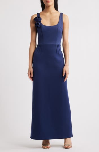 Easy to style up or down, this fitted, bra-friendly maxi dress is eased with a back slit and accented with a pair of rosy details.