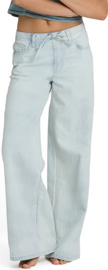 Drapey wide legs punctuate these light-wash jeans updated with a tied back elastic waist.