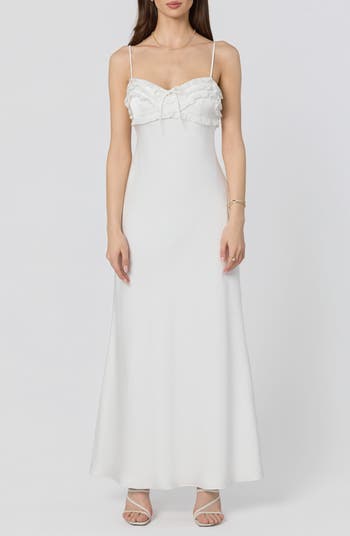 A ruffle-trimmed bodice adds a romantic finishing touch to this smooth satin slipdress in an A-line silhouette.